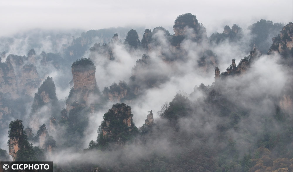 ↑2026年3月8日,湖南张家界国度丛林公园十里画廊景区雨后霏霏缭绕。(无东谈主机相片)CICPHOTO/吴勇兵 摄