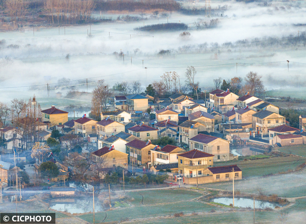 ↑2026年2月21日,江苏省句容市白兔镇晨雾缭绕。(无东谈主机相片)CICPHOTO/陈岗 摄