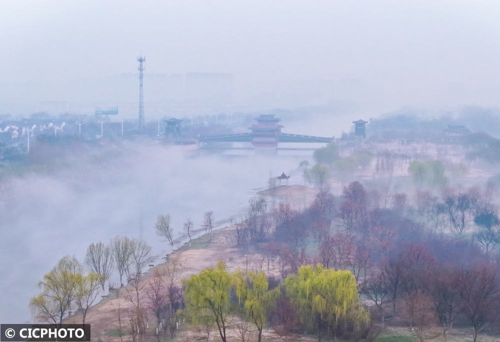 ↑2026年3月12日,江苏省宿迁市泗洪县石集乡瓦房村晨雾缭绕。(无东谈主机相片)CICPHOTO/张连华 摄