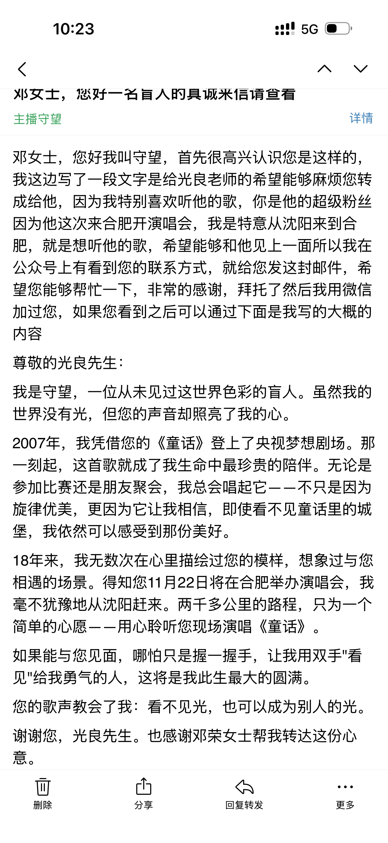 祈望说,光良出说念30年,他心爱《童话》,也心爱了18年。相近合肥站演唱会,光良的牙东说念主邓女士收到了祈望写的一封邮件:“我是祈望,一位从未见过这全国颜色的盲东说念主。天然我的全国莫得光,但您的声息却照亮了我的心。”